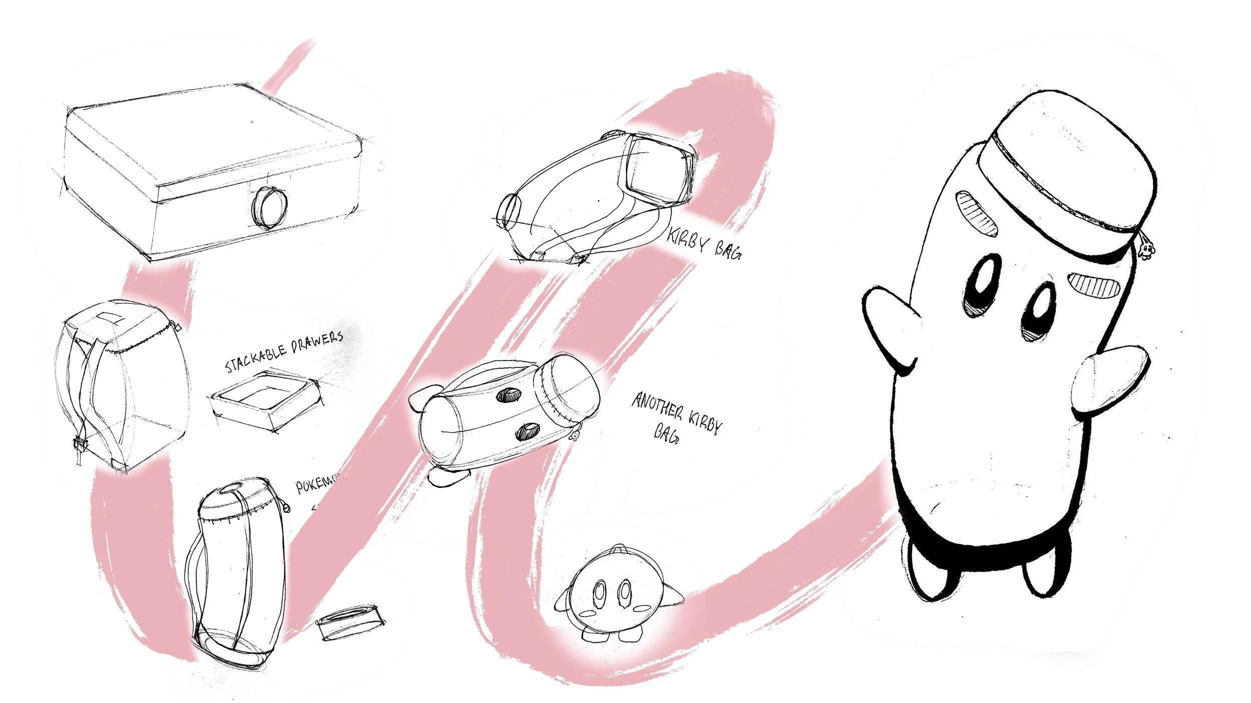 Ultimately I ended up choosing to flesh out a concept of a Kirby bag, which could be thrown in the corner of a room and become a decoration rather than clutter. This would decrease the frequency that cleaning is needed, and make organization easier.